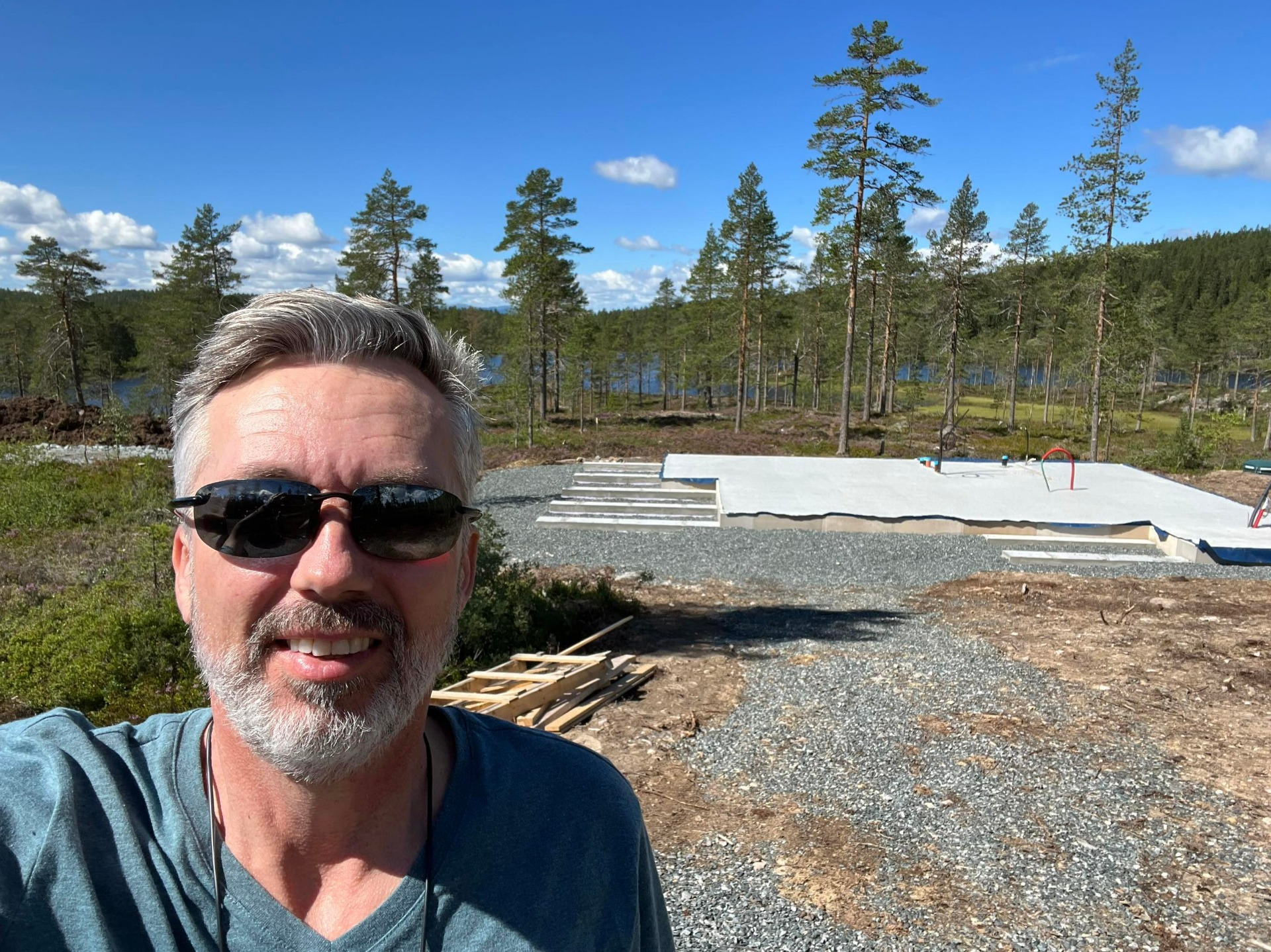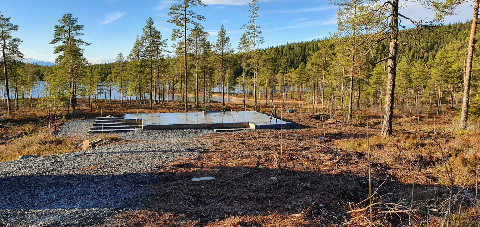 Taket har fått mebrand, dører en innsatt og nesten alt av utvendig panel er på plass. Stillasje er tatt ned. Neste uke blir det nok torv på taket og isolasjon i veggene.