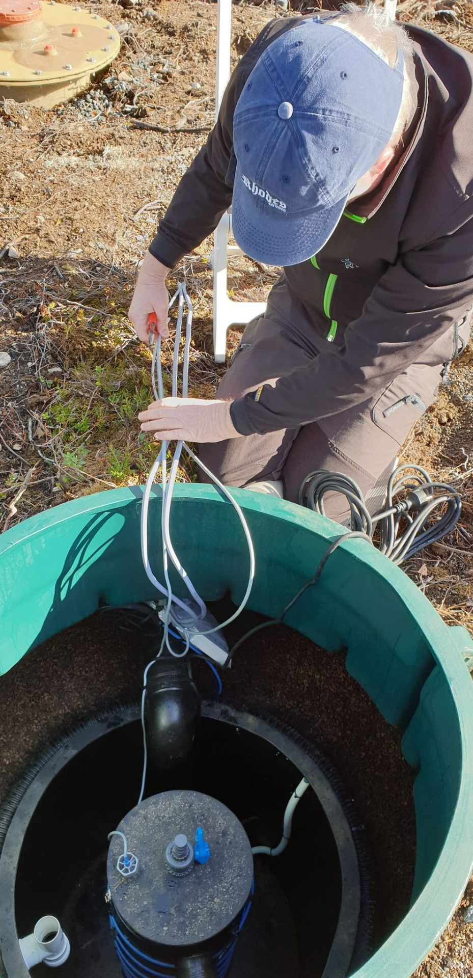 Lørdag den 24 september var vi igjen tilbake på tomta. Litt for å se hvordan nabohytte hadde kommet opp, litt for å gå tur og for å koble til gråvannsanlegget. Jobben der består av å skjøte kabler. En for varme, en for pumpe og en for alarm. Vi har tidligere lagt rør fra bod til tanken og trukket kabler. Vanlig koblingsboks er lite egnet her så jeg har skjøtet kablene med krympeskjøt og trukket skjøtene inn i røret. Dette blir bra.