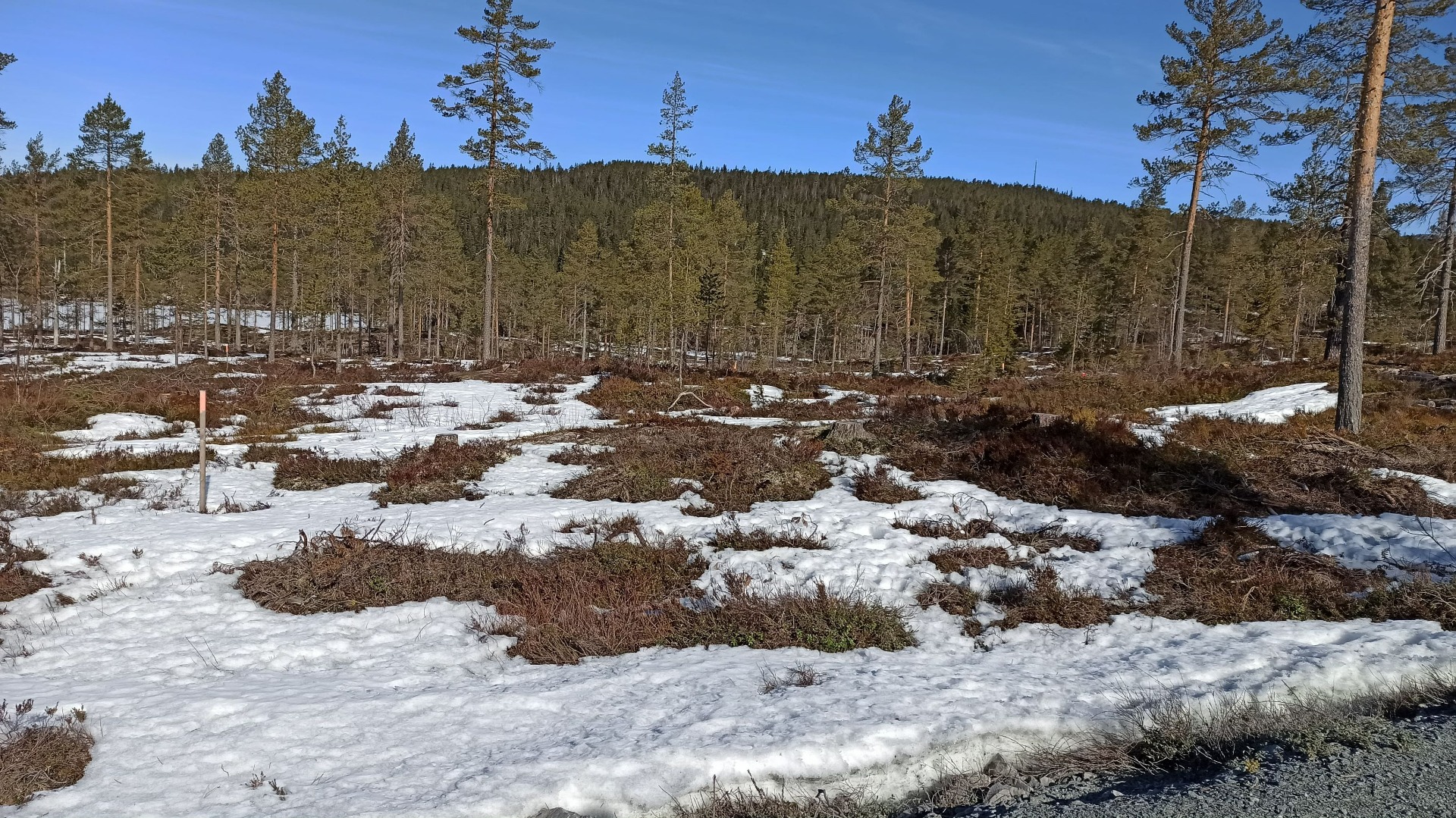 Gjennom hyttenabo hørte vi at grunneier skulle felle noen trær. Her snudde vi oss kjapt og fikk samtidig høgd ned trærne på vår tomt. Grunneier fikk det nedhogde som betaling. Det var en bra deal. Her sparte vi oss for mye jobb selv om vi hadde sett frem til å hogge vår egen ved.