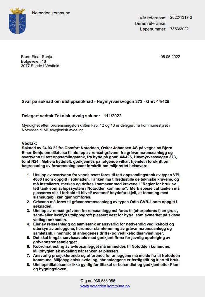 Den 5 mai fikk vi godkjent utslipptillatelse av gråvann og godkjent nedgraving av tett tank for brunvann. Tankene er planlagt nedgravd på hyttas vestre side med kortest vei til badet. Tanken for gråvannet er høy og trenger en god dybde. Har man ikke det må det trolig sprenges litt.