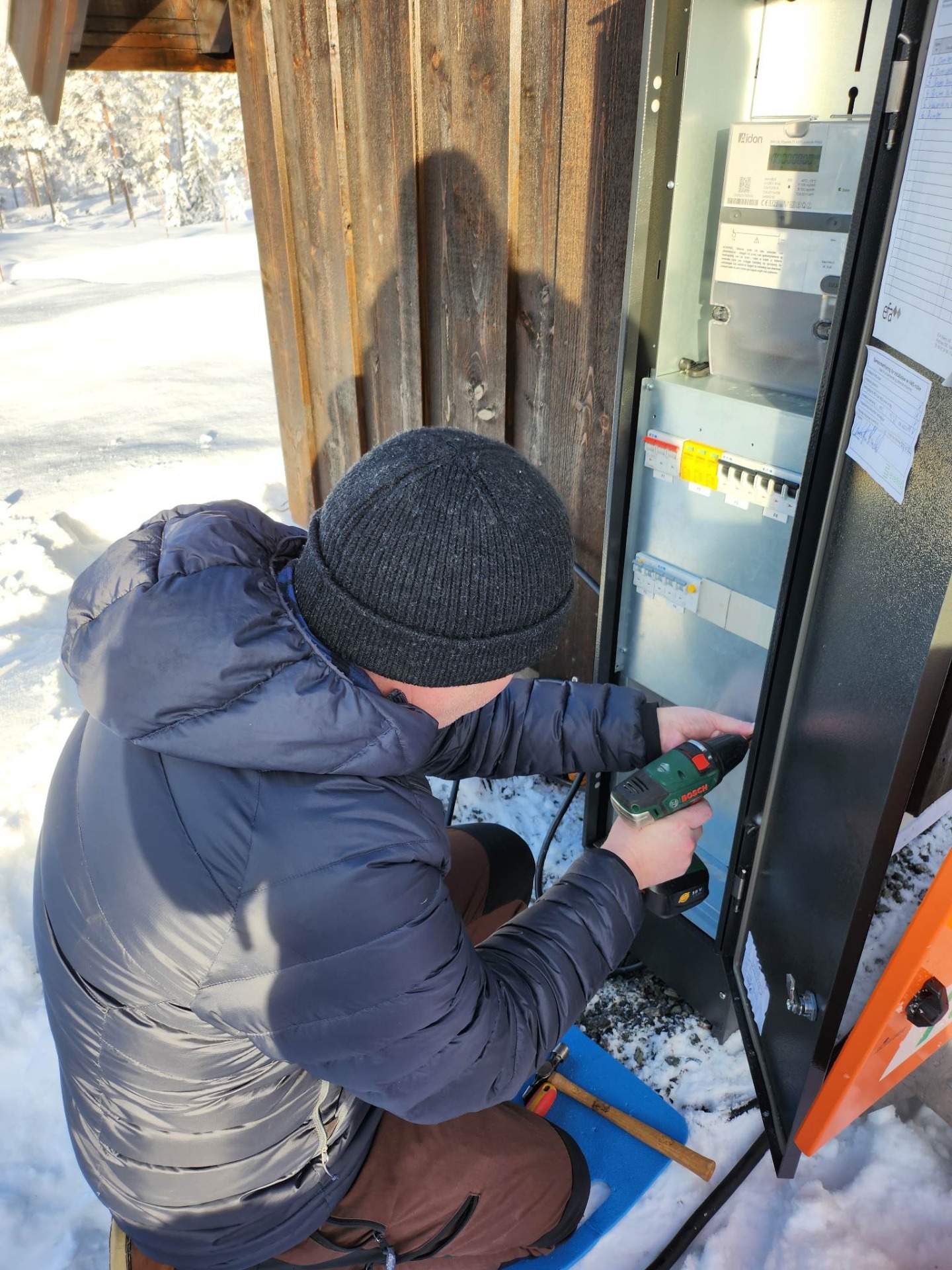 Det har nå kommet VELDIG mye snø. Mye nedbør i den siste tiden har kommet som snø på Meheia. Det er nå etter siste snøfall over en meter. Vi har avtalt med brøyter at de skal brøyte veien ned. Selve plata og rundt er også satt bort til andre. Det er viktig at alt er klart til snekkerlaget kommer 30 januar. Lørdag den 14/1 var vi på tomta. Nydelig vær med sol og minus 4 grader. Koblet til provisorisk byggestrøm i skapet og hang kabelen på veggen til pumpehuset. Knut og Karianne var på hytta så vi tok en tur innom dem.