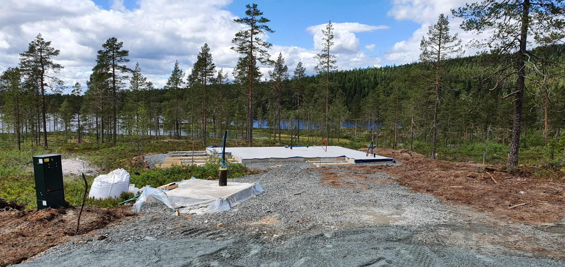 Grunneier Thomas Tinne skal sørge for brønn med vann for de tre tomtene. Det er støpt plate til pumpehuset. Huset heises på plass i skrivende stund. Da er det klart for å installere vårt tilknytningskap inntil bygget. Dette skapet var planlagt montert inntil hytta, men jeg fant ut at det ville være en bedre løsning og montere det i nærheten av pumpehuset og parkeringsplassen. Dette ble avklart med netteier og grunneier. Fordelen med å ha det der er at man får strøm til elbillading tilgjengelig og man kobler til pumpeanlegget fra eget abonnement. Dessuten slipper man det stygge skapet rundt huset. Siden skapet er innkjøpt er det greit å få installert dette så fort som mulig. Det tar jo mye plass i boden vår. Håper å få det til denne uka. Strøm frem til hytta legges opp av netteier. Det er gravd frem en kabel som går frem til det grønne skapet på bilde. Her vil det bli kortslutninssikringer for hver hytte. Skapet burde vært montert inntil pumpehuset for å stå mer beskyttet. Men dette er netteiers valg. Når jeg plasserer "mitt" skap får jeg ha det i bakhodet at everkets skap kan bli flyttet.