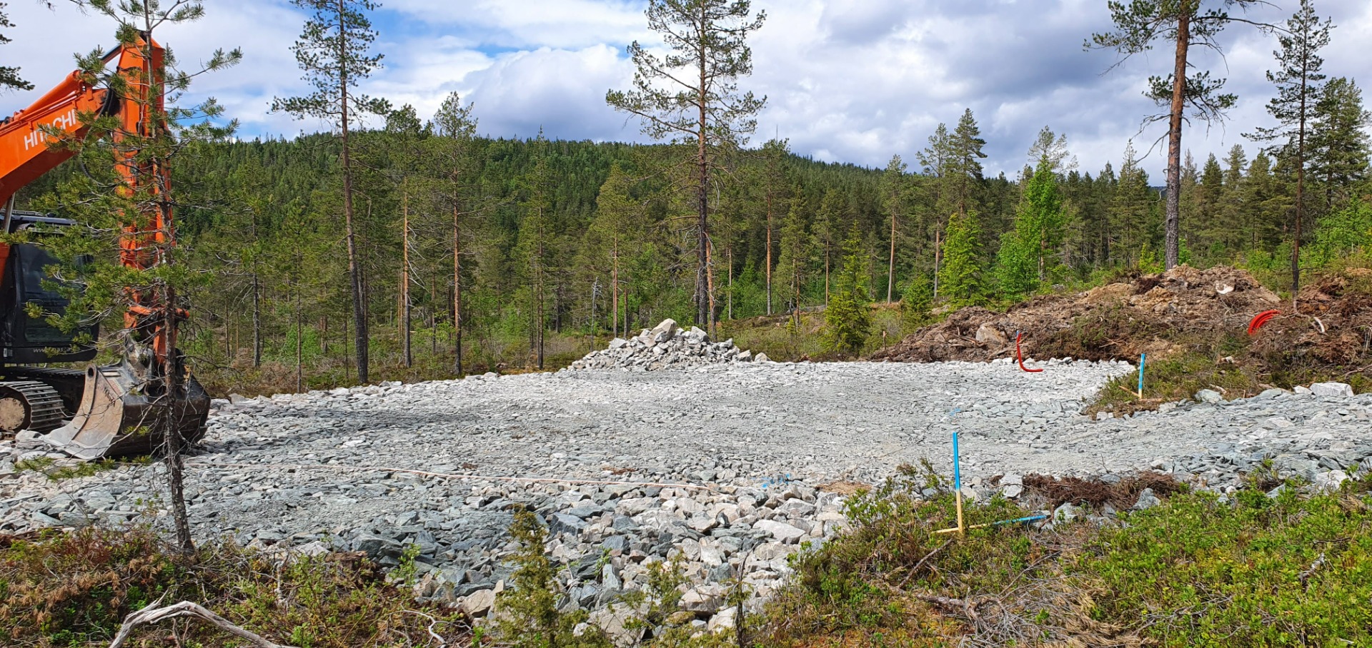 Graver begynte utgraving tidlig i juni. Den 14 juni var det klart for meg å legge ned jording. Jordlelektroden bør legges 5o cm fra grunmur og under drenering. Det ble 50 meter i pukk/grus. I tillegg monteres jordspydd for å avlede overspenninger.